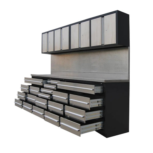 The TMG-WBC20DS Pro Series Stainless Steel 10-FT 20 Drawer Workbench Cabinet Combo is a versatile, commercial grade storage and work surface soluti...