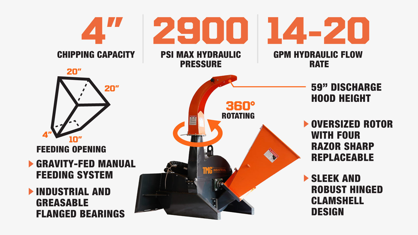 The TMG-WC42S Skid Steer Wood Chipper is the quintessential add-on accessory needed at your home, acreage or farm. Equipped with a direct drive, high torque cycloidal motor and universal skid steer mount, this wood chipper is easy to attach and transfers power straight from your skid steer to the unit through hydraulic hoses and flat-faced couplers. Picking up logs, branches and debris is usually time and energy consuming. However, whether you're pruning, cleaning up from a storm or just processing general gardening waste, our skid steer wood chipper makes the milling work on your property effortless and fun to do.