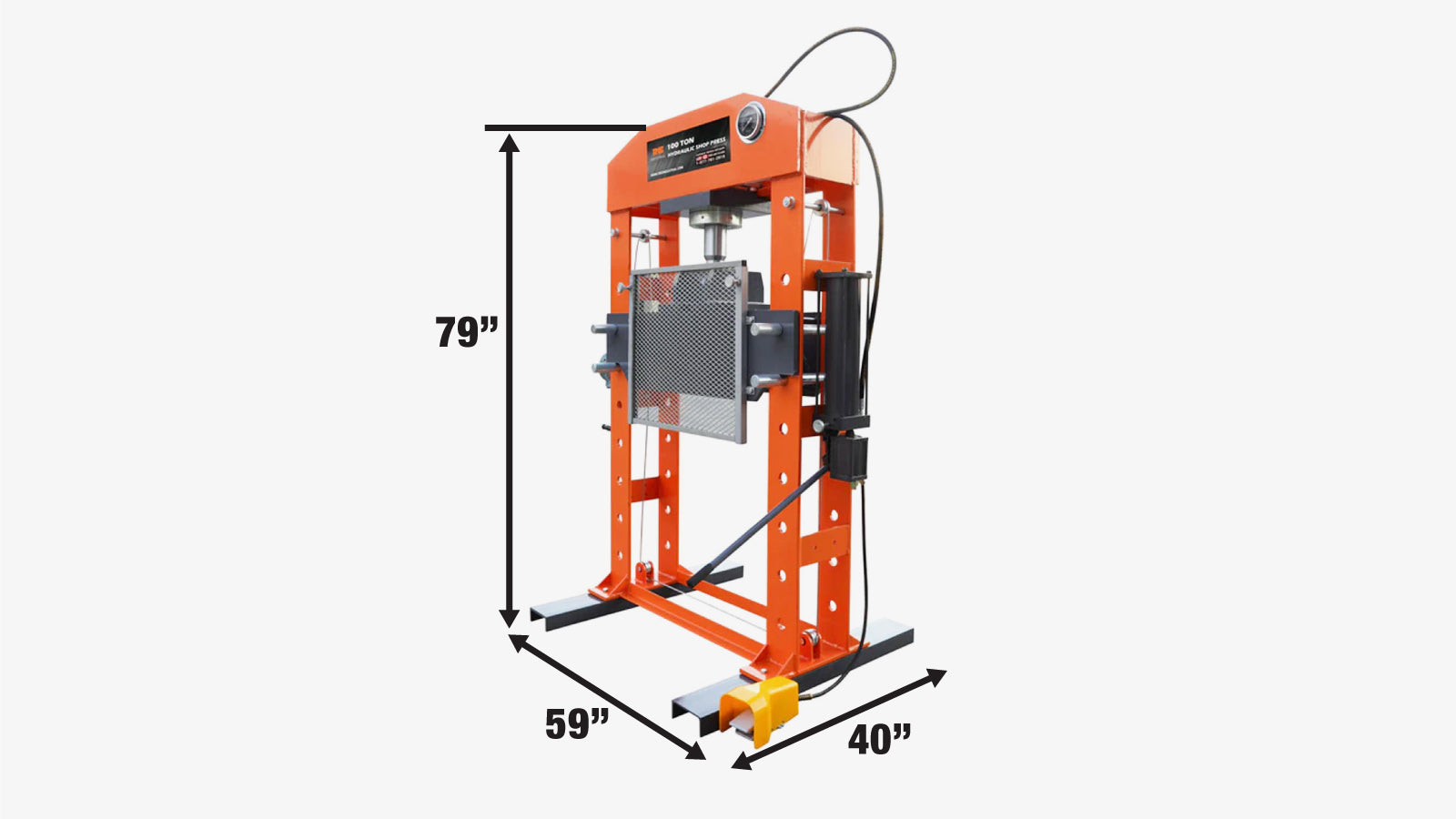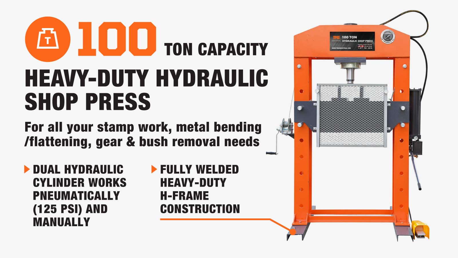 100 Ton Capacity Hydraulic Shop Press, Heavy Duty Pressing, Protective Grid Guard, Fully Welded H-Frame, Air & Manual Dual Operation, TMG-SP100-specifications-image