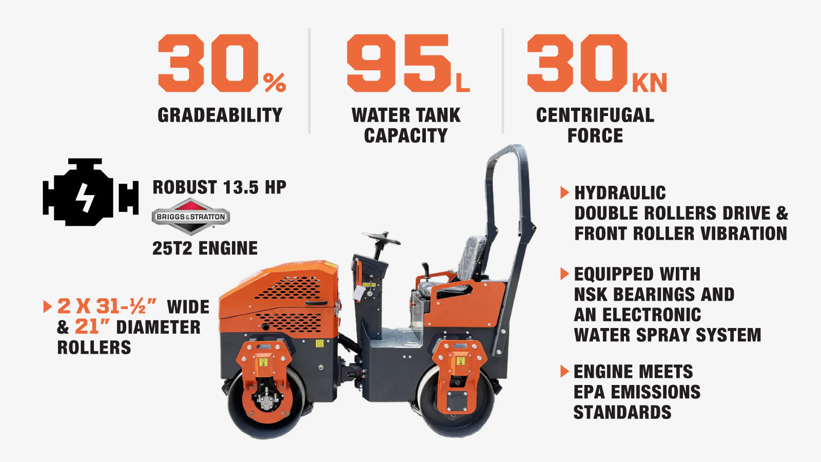 13.5 HP Ride-On Road Roller, 2 x 31-½" Wide & 21" Diameter Rollers, EPA Emissions Compliance, TMG-MVR45