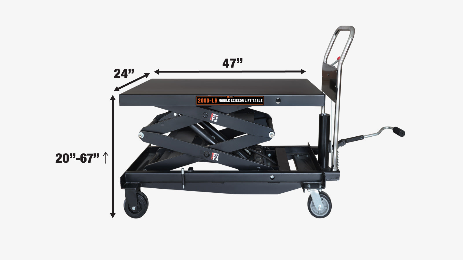 A foot pedal allows you to operate the hydraulic tabletop with ease, and lowers the risk of injury by eliminating the need to bend down and manually adjust objects. Simply pump the table up to your desired height, and use the conveniently located handle-mounted pressure release to have total control over the descending speed.