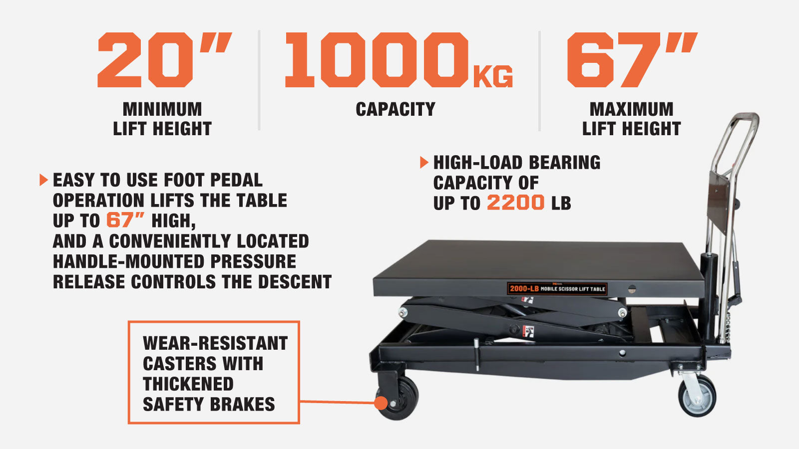 • Easy to use foot pedal operation lifts the table up to 67” high, and a conveniently located handle-mounted pressure release controls the descent