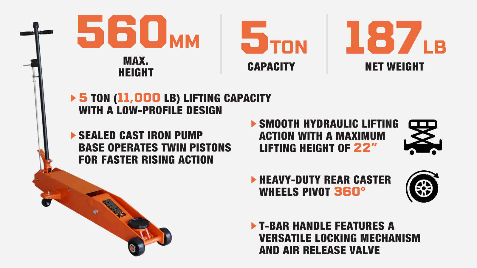 5 Ton Long Reach Chassis Service Jack, Single Piston, 6-1/2" Ground Clearance, 360° Pivot, TMG-AJL05