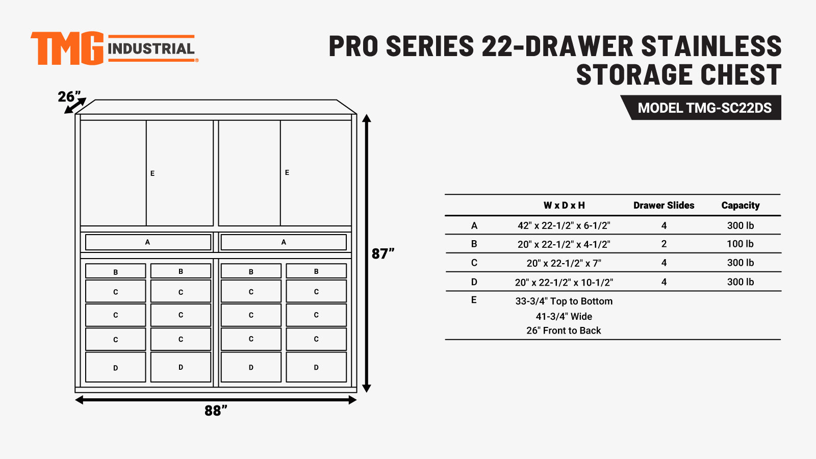Pro Series 7-Ft 22 Drawer Stainless Steel Storage Chest, Top Cabinets, All-in-One Welded Frame, Keyed Alike Locks, TMG-SC22DS