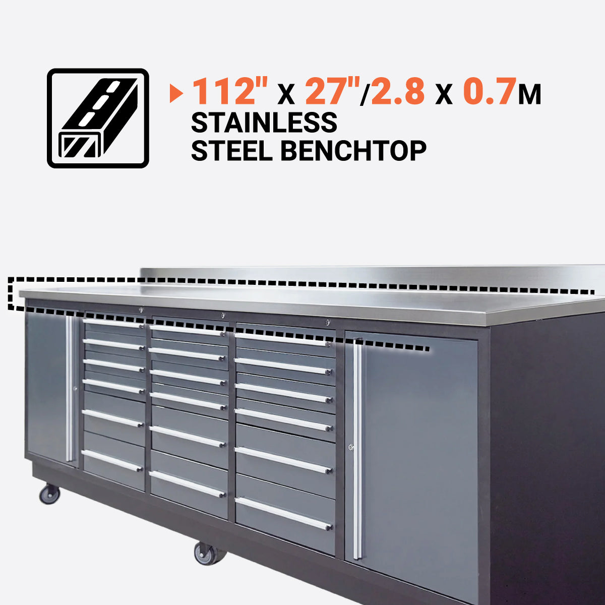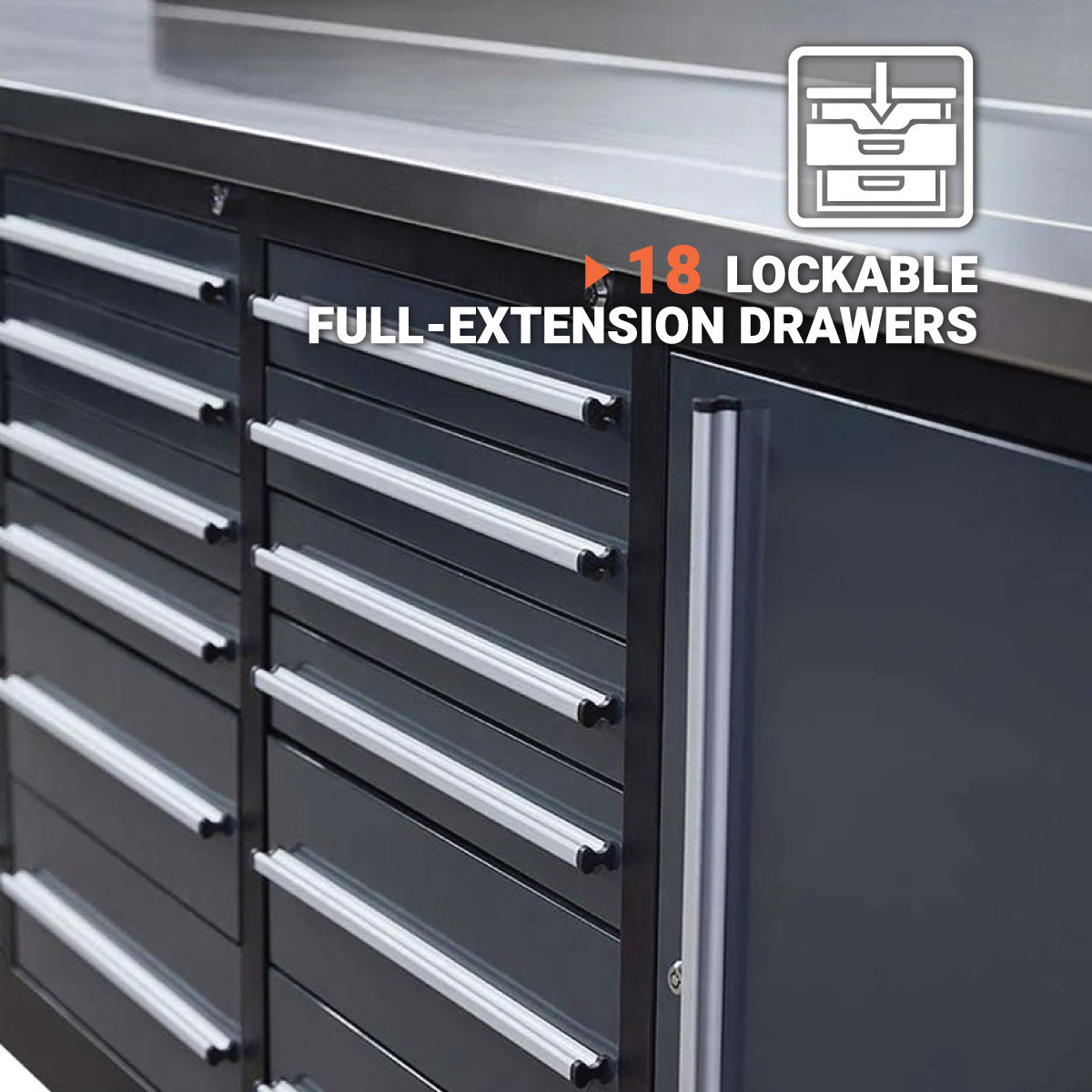 Pro Series 9-Ft 18-Drawer Workbench with Stainless Steel Top, Ball Bearing Double Slides & Casters, TMG-WB918
