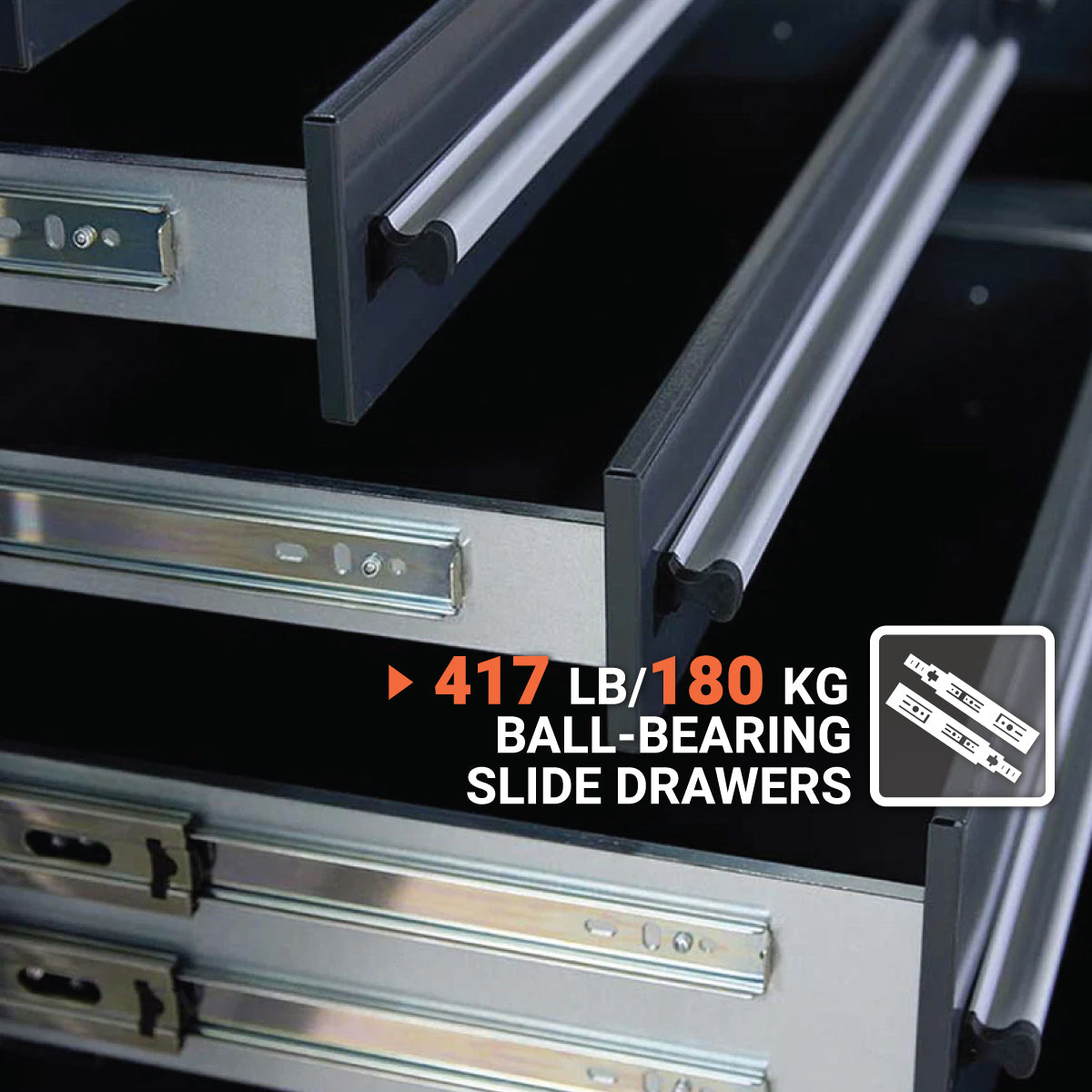 Ideal for professionals requiring ample space, this workbench features all-steel construction, heavy-duty ball bearing slides, and a powder-coated finish for lasting durability