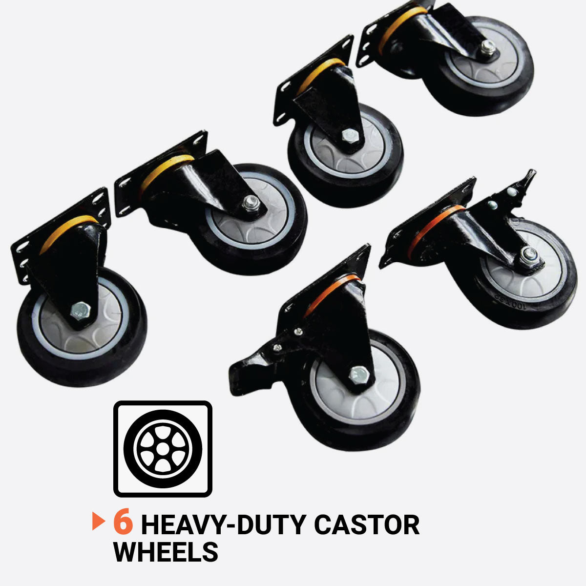 Each skinny drawer can handle up to 200 lb, while medium and deep drawers support up to 400 lb each, making it perfect for heavy tools and equipment. The 4" back lip and 6 casters provide added convenience, ensuring this mobile workbench is as practical as it is tough.
