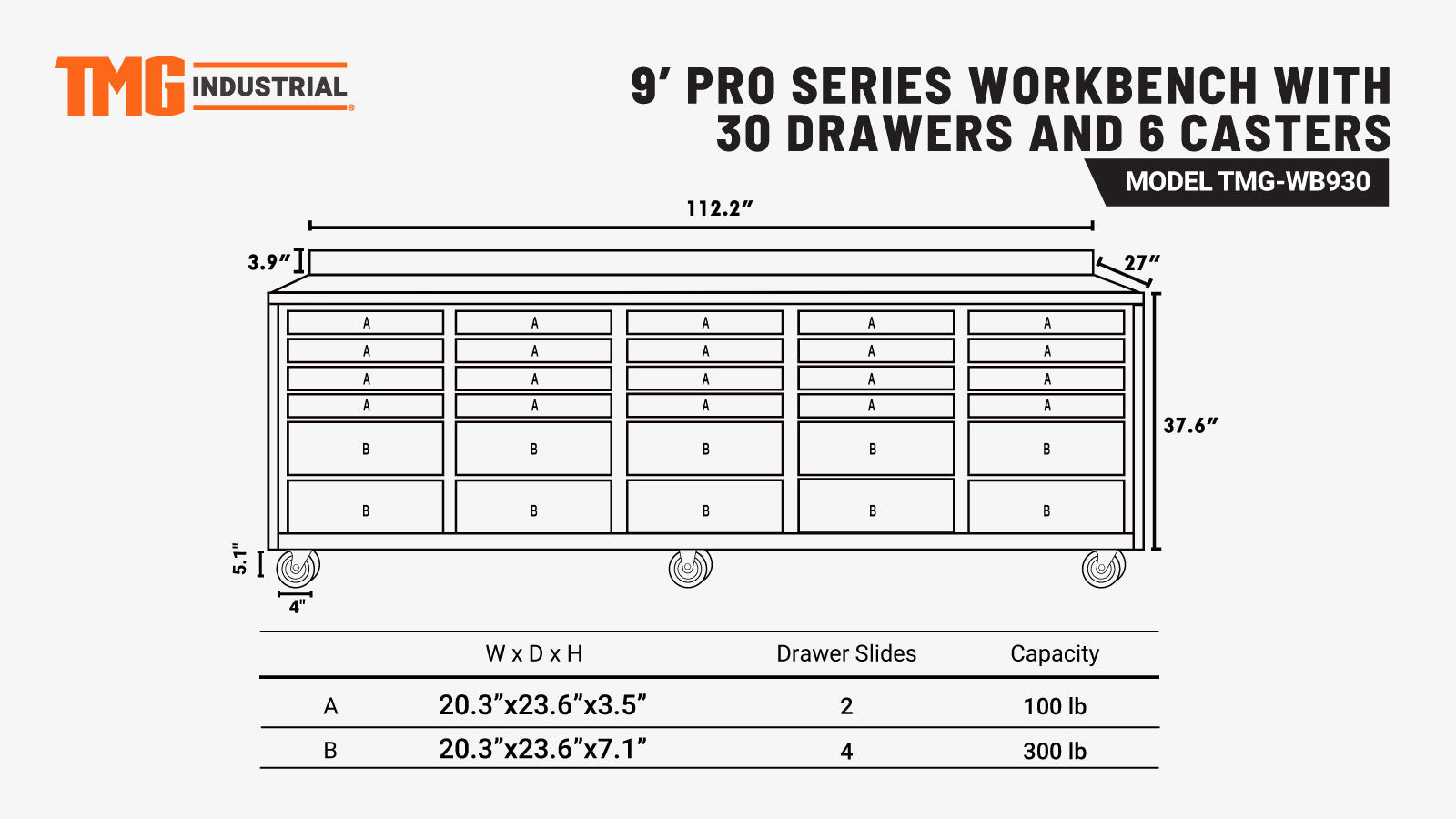 Pro Series 9-Ft 30-Drawer Workbench with Stainless Steel Top, Ball Bearing Double Slides & Casters, TMG-WB930