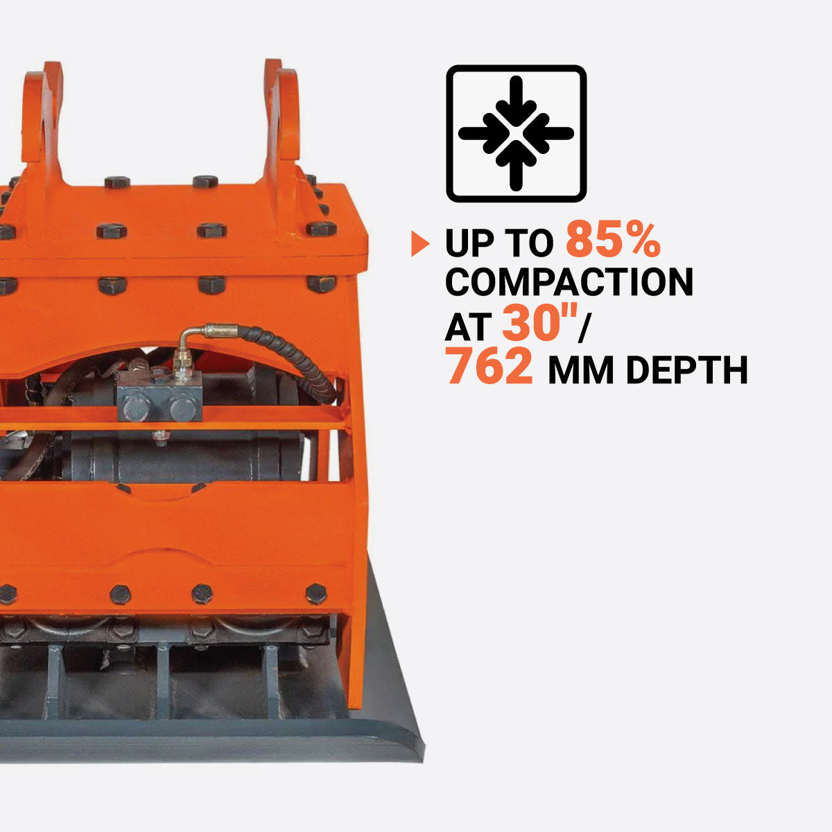 Eccentric weight vibration has been engineered for optimal soil compaction that translates to an 85% compaction density at 30" depth. Industrial grade rubber cushion isolates reverberations from reaching the boom, motor and bearings of the carrier ensuring minimal wear and tear and maximum force into the ground. An overload valve shutoff keeps the motor within its working range to prevent damage and extend the compactors lifespan.