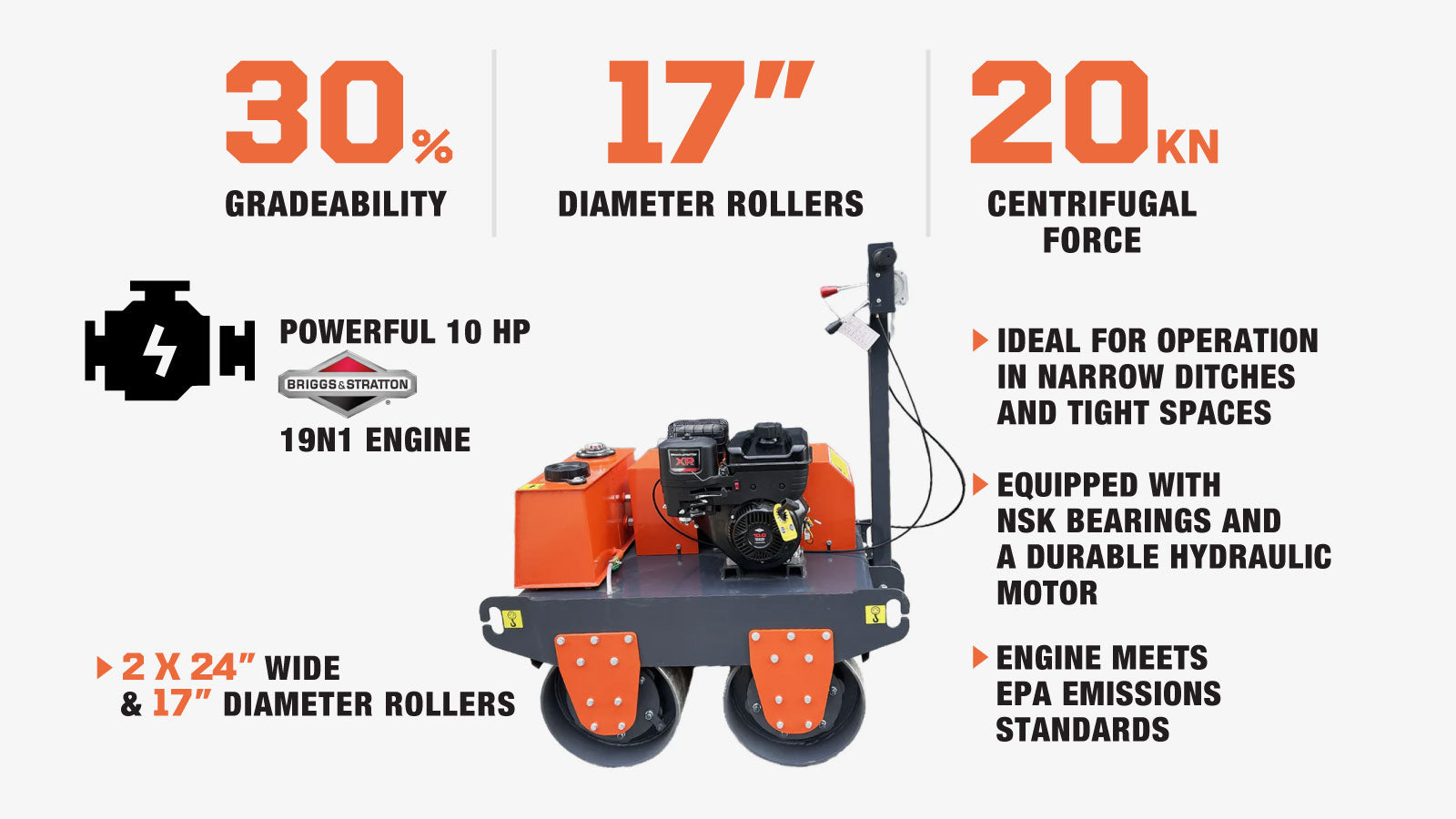 10 HP Double Wheel Vibratory Roller, 2 x 24" Wide & 17" Diameter Rollers, EPA Emissions Compliance, TMG-MVR25