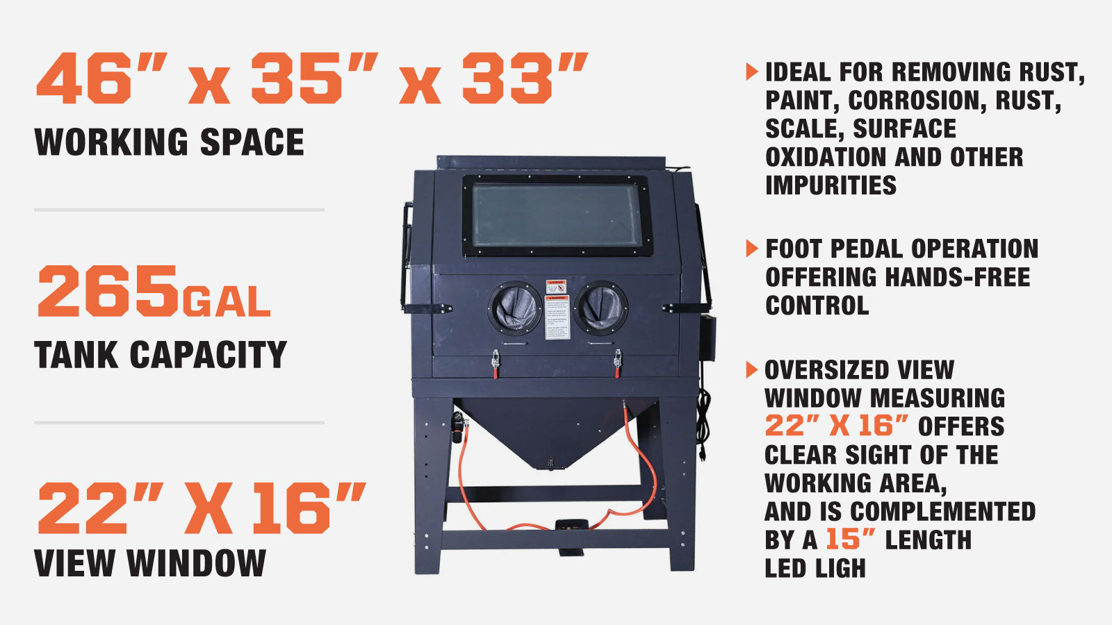 265 Gallon/990L Commercial Cabinet Sandblaster, Vacuum Filtration System, Oversized View Window, 125 PSI, 24 CFM, TMG-ABC99