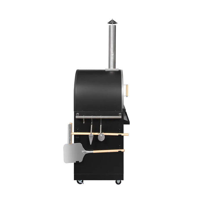 Measuring 11' long and finished in a sleek, modern black coloring, this island also features a built-in pizza oven with a ¾" cordierite stone for crispy, delicious pizzas every time. A 3-layer service cart keeps all your essentials organized and within reach, and the industrial-grade sink makes cleaning up simple and convenient.