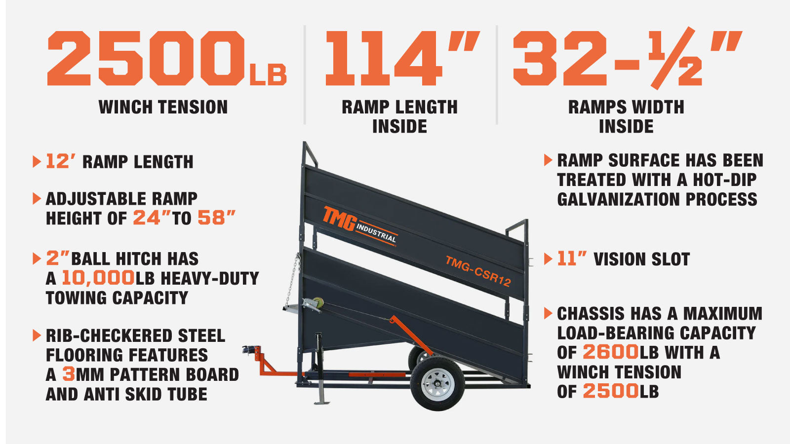 10,000 lb ball hitch heavy-duty towing capacity allows you to move your livestock with confidence. Maximum load-bearing of the chassis itself is 2600 lb with a winch tension of 2500 lb. Ramp height can be adjusted between 24" and 58" to accommodate your trailer. An 11" vision slot also allows you to easily monitor your cattle and guide them through the loading process.