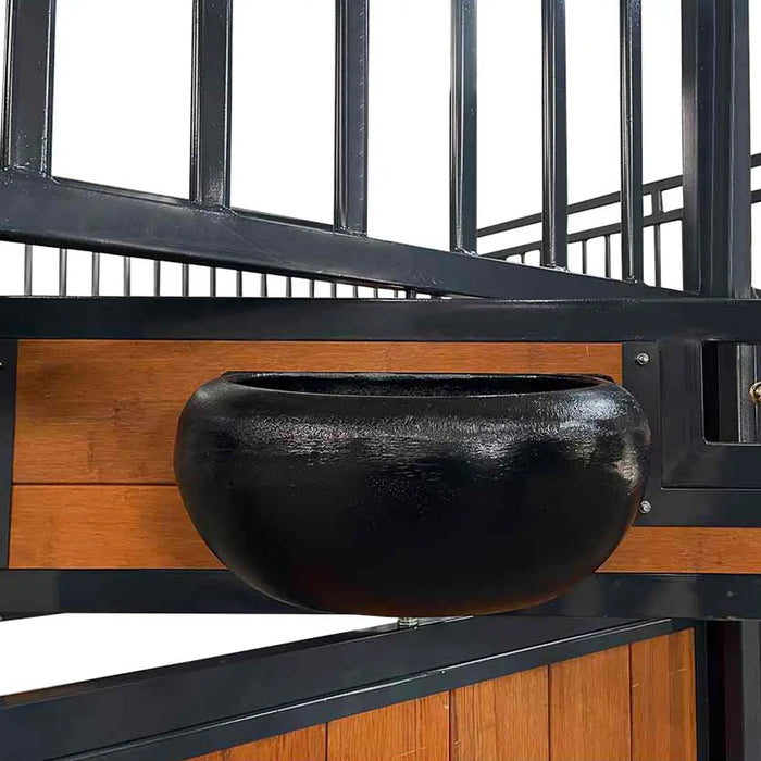 • The classic design of this horse stall features a vertical bar top with a bamboo-filled bottom, creating an attractive and timeless look that will complement any barn