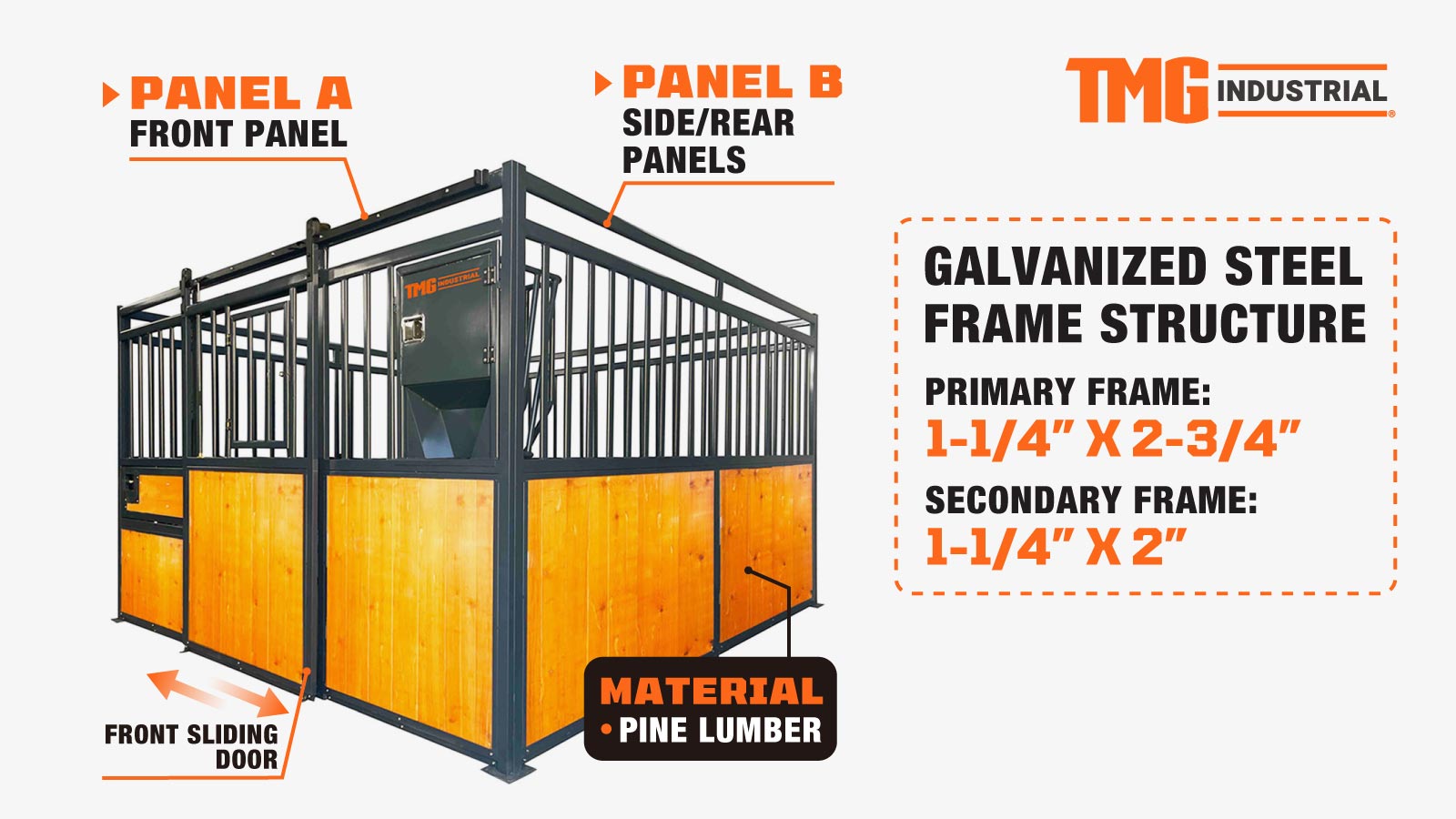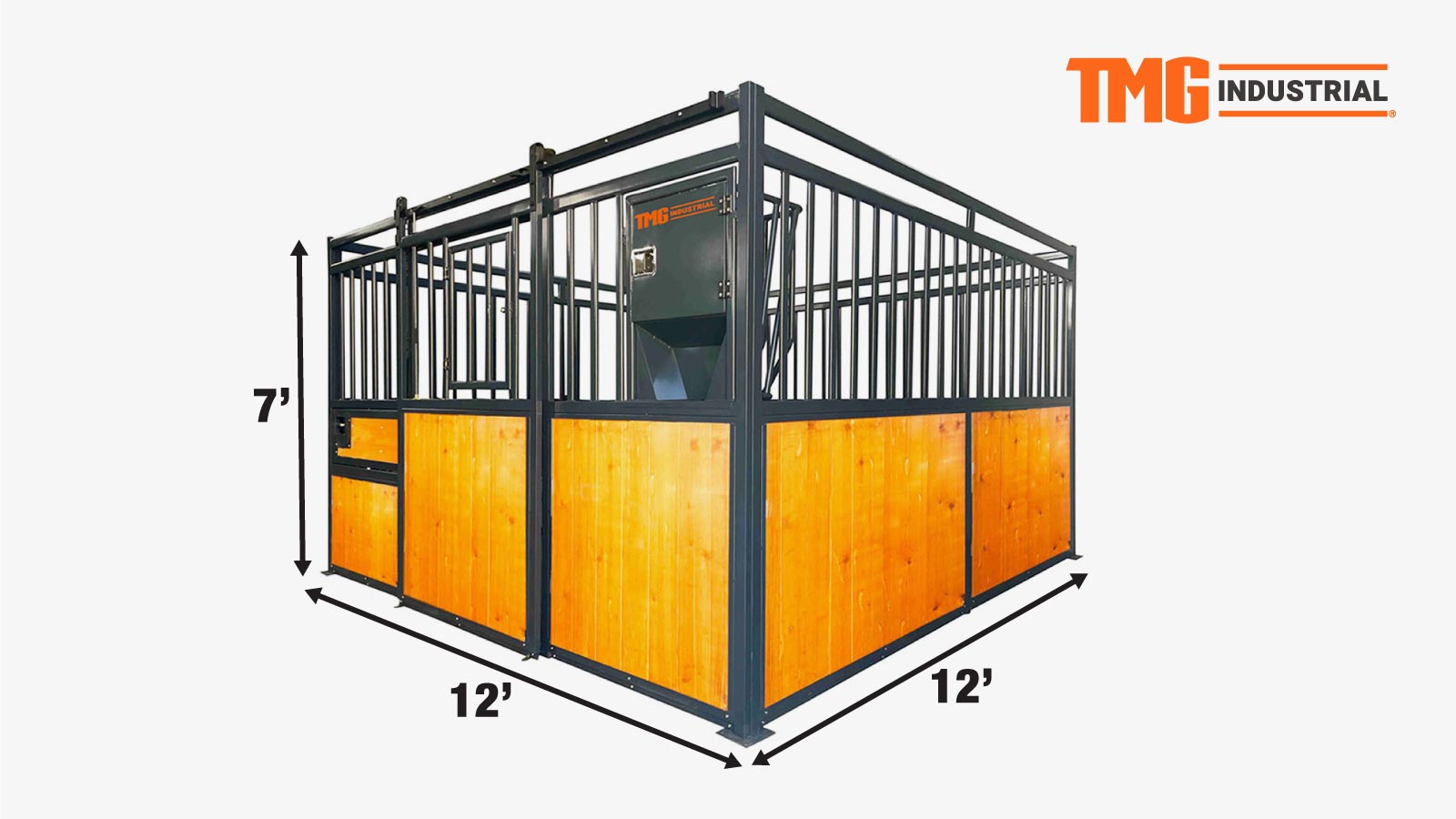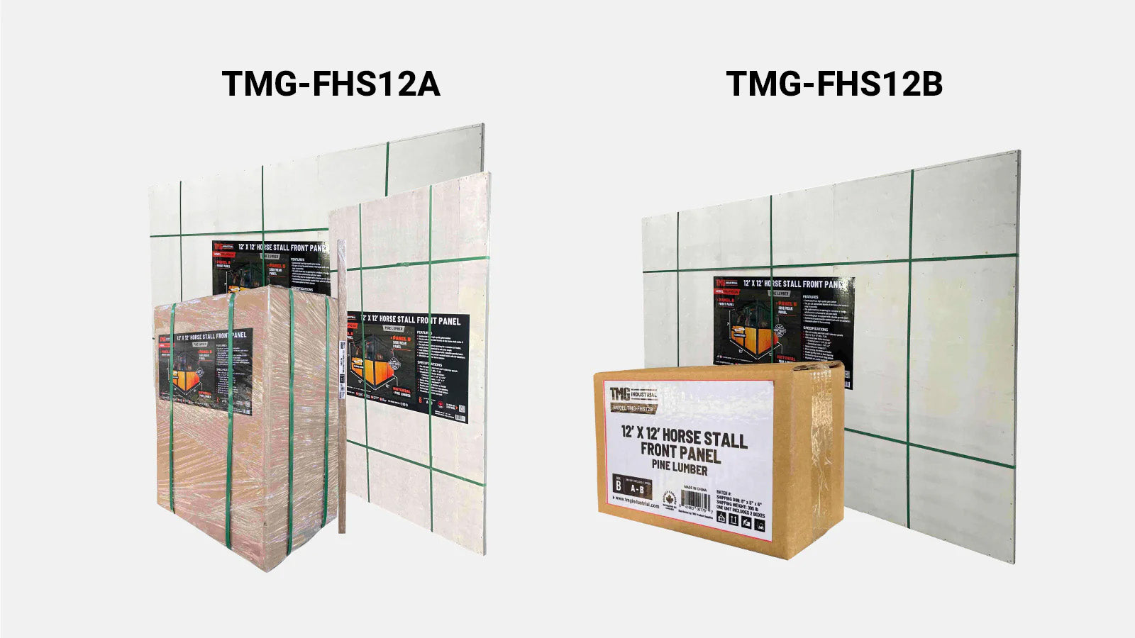 12’ Horse Stall Pine Lumber Panel, Vertical Bar Top & Wood-Filled Bottom, Front panel c/w Window/Feeder and Sliding Door, TMG-FHS12A and FHS12B