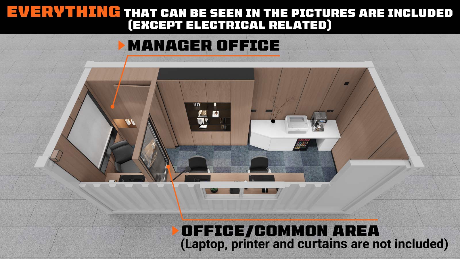 20’ Custom Built Steel Container Office, Working Area & Manager’s Office, 1 Leather Office Chair, 3 Ergonomic Office Chairs, TMG-SCO20