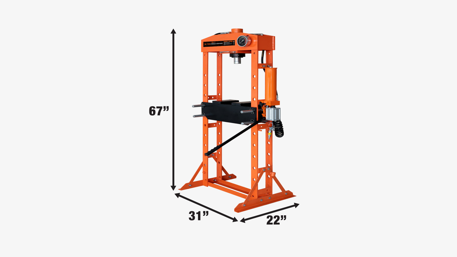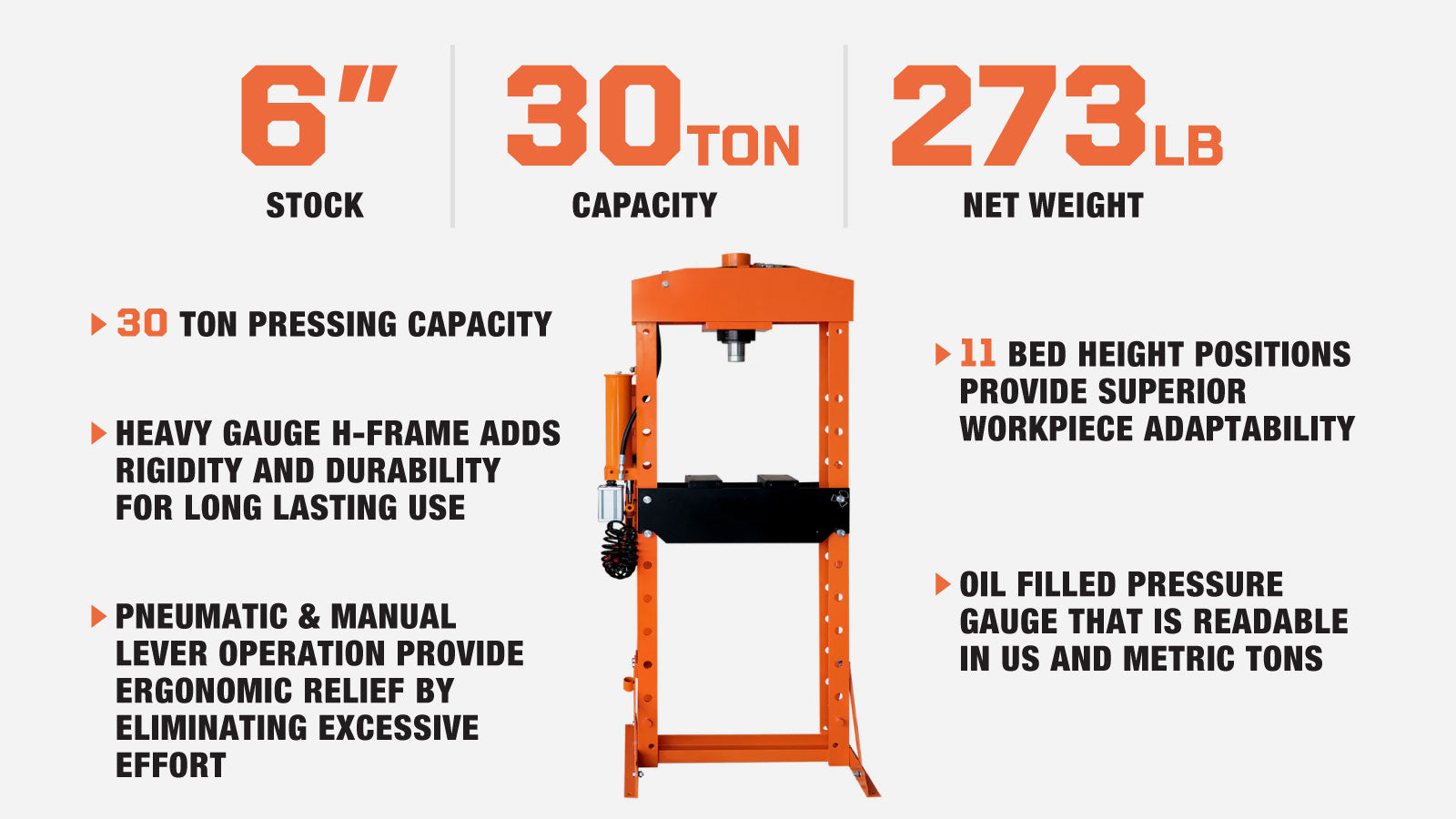 30 Ton Capacity Hydraulic Shop Press, Pneumatic & Manual Operation, 11 Bed Height Positions, TMG-ASP30