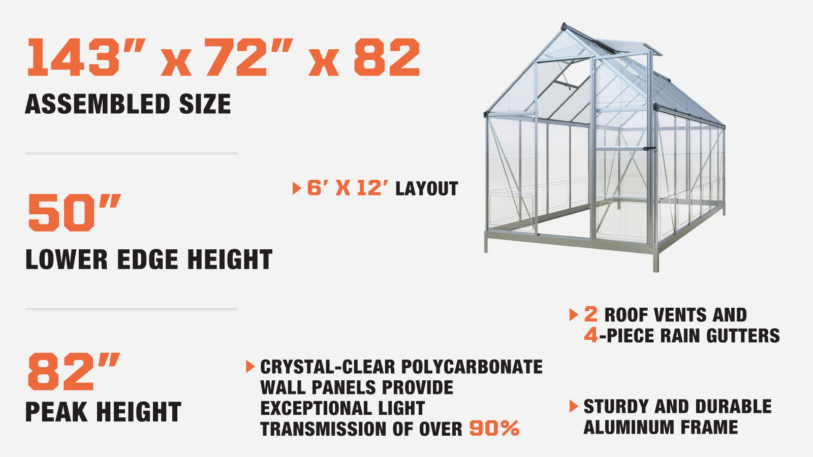 • Crystal-clear polycarbonate wall panels provide exceptional light transmission of over 90%, allowing your plants to thrive under optimal sunlight