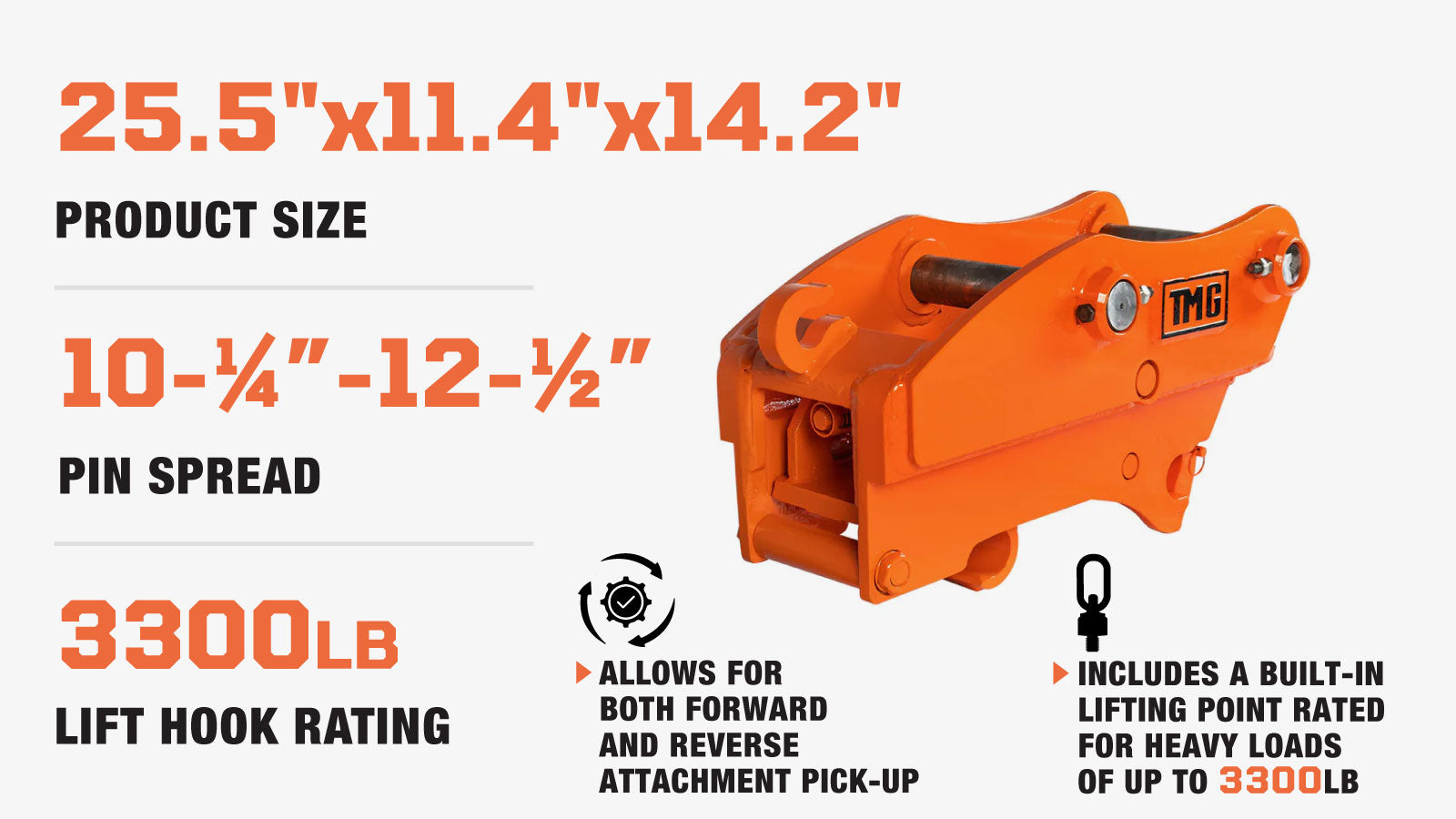 Quick Coupler for Excavator, 2" Pin Diameter, 10-¼"-12-½" Pin Spread, Built-In Lifting Point (3300 Lb Rating), TMG-EQC50