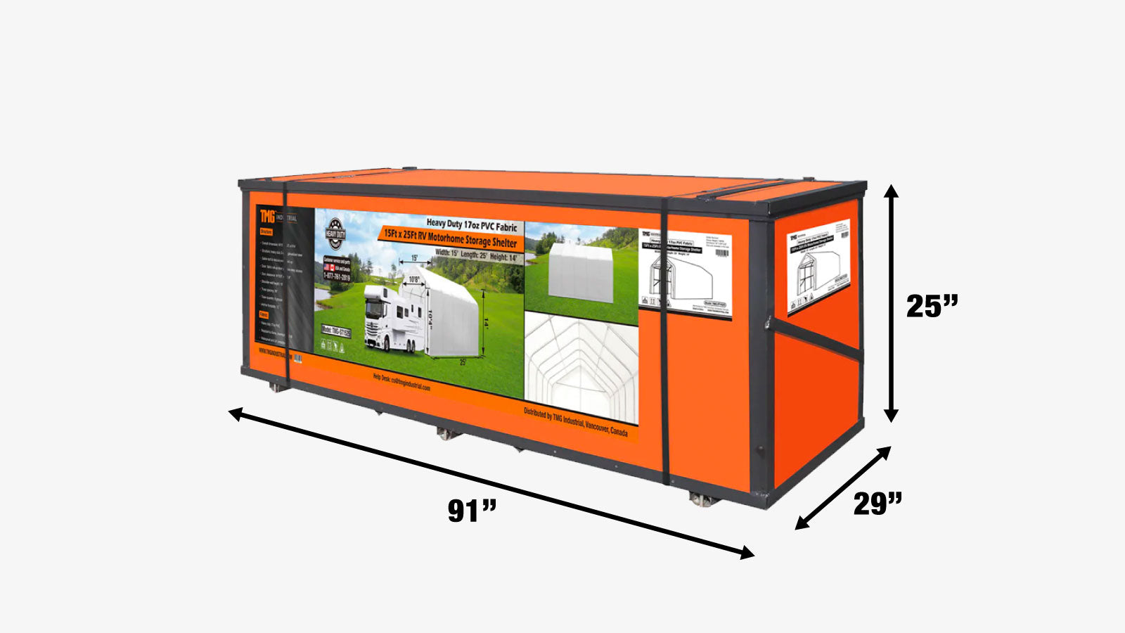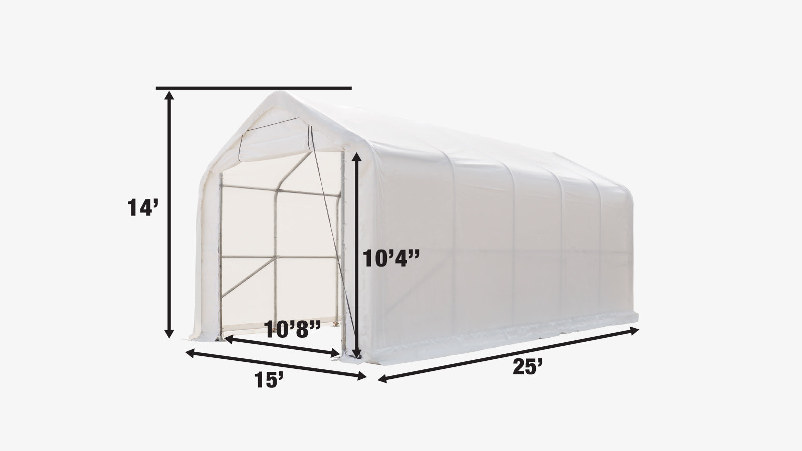 15’ x 25’ RV/Motorhome Storage Shelter, 17 oz PVC Fabric Cover, Front Roll-Up Door, Enclosed Rear Wall, 3-Layer Galvanized Steel Frame, 10’ Straight Sidewalls, TMG-ST1525