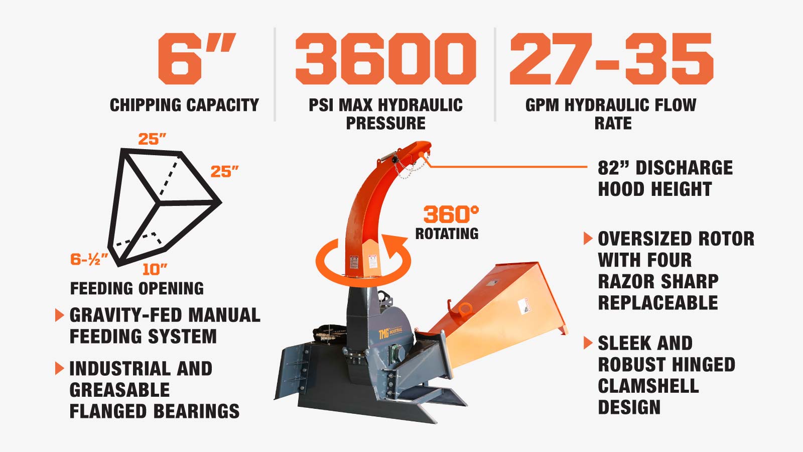 6" Skid Steer Wood Chipper, Gravity-Fed, Universal Skid Steer Mount, TMG-WC62S